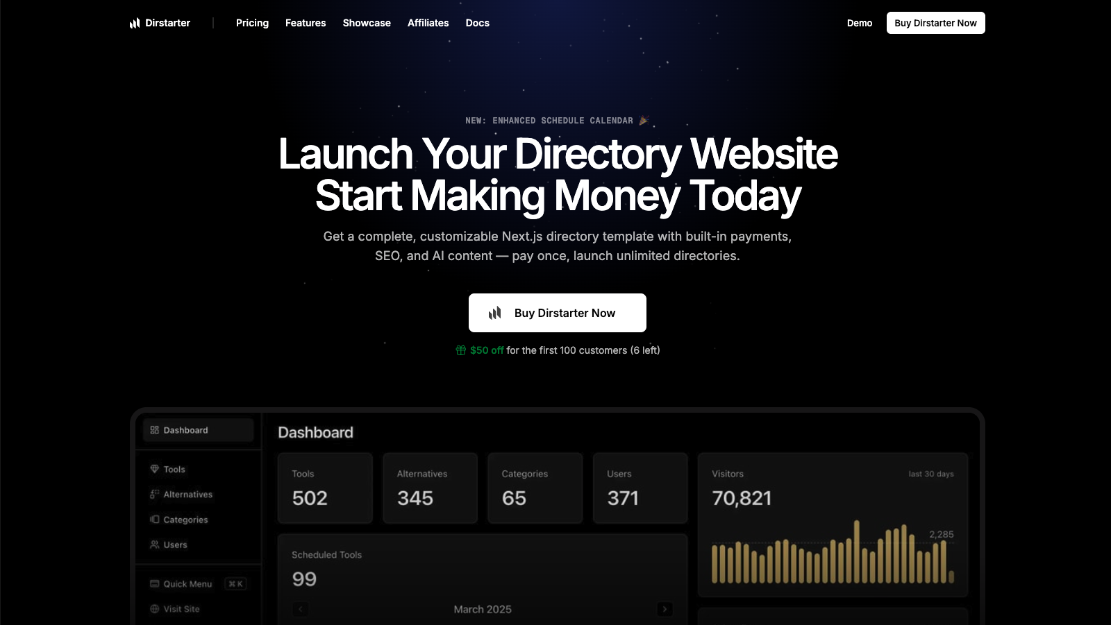 Get a complete, customizable Next.js directory template with built-in payments, SEO, and AI content — pay once, launch unlimited directories.